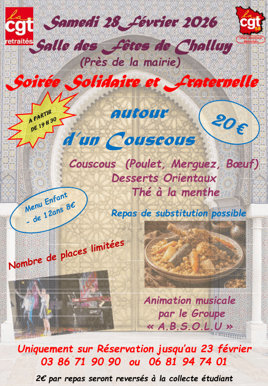 « Tous les Évènements SOIRÉE COUSCOUS -CHALLUY février 28 @ 19 h 00 min – 23 h 30 min Ajouter au calendrier Google Agenda iCalendar Outlook 365 Outlook Live